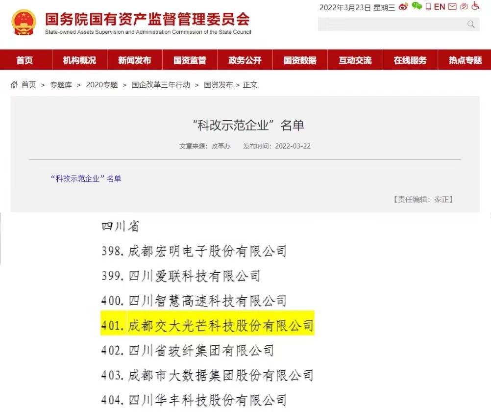 3月22日,交大光芒作為四川省七家入選企業(yè)之一,被國務院國資委納入“科改示范行動”企業(yè),此次“入選”,是繼2021年入選四川省國資委“天府國企綜合改革行動”企業(yè)的又一重大突破,也是省屬科技型企業(yè)中為數不多的“雙入選企業(yè)”,給公司深化改革、自主創(chuàng)新、跨越發(fā)展再添新活力。