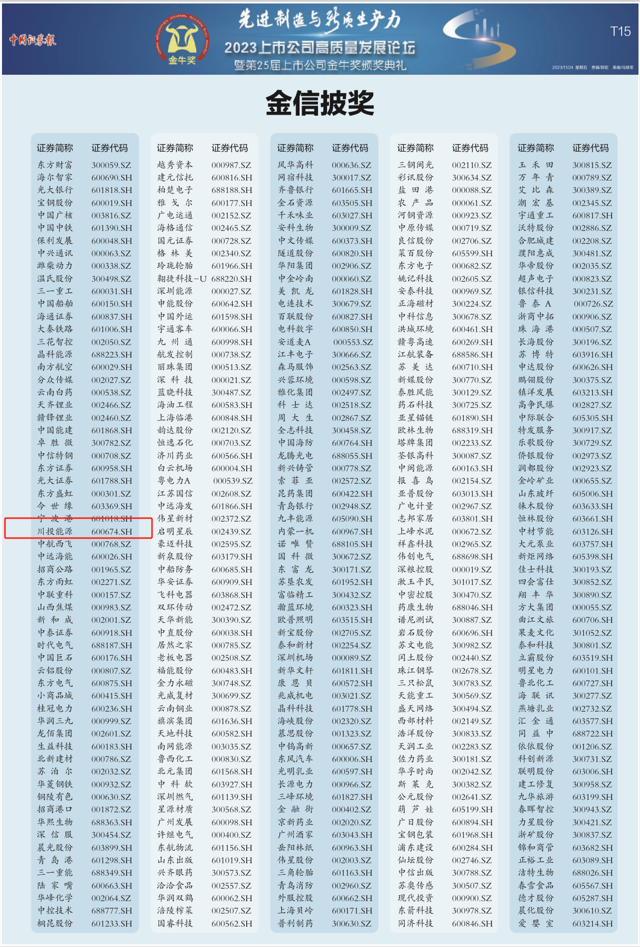11月24日,由中國(guó)證券報(bào)主辦的“第二十五屆上市公司金牛獎(jiǎng)”榜單揭曉,川投能源憑借穩(wěn)健增長(zhǎng)的業(yè)績(jī)、不斷提升的綜合實(shí)力和高質(zhì)量的信息披露,榮獲“2022年度金信披獎(jiǎng)”。