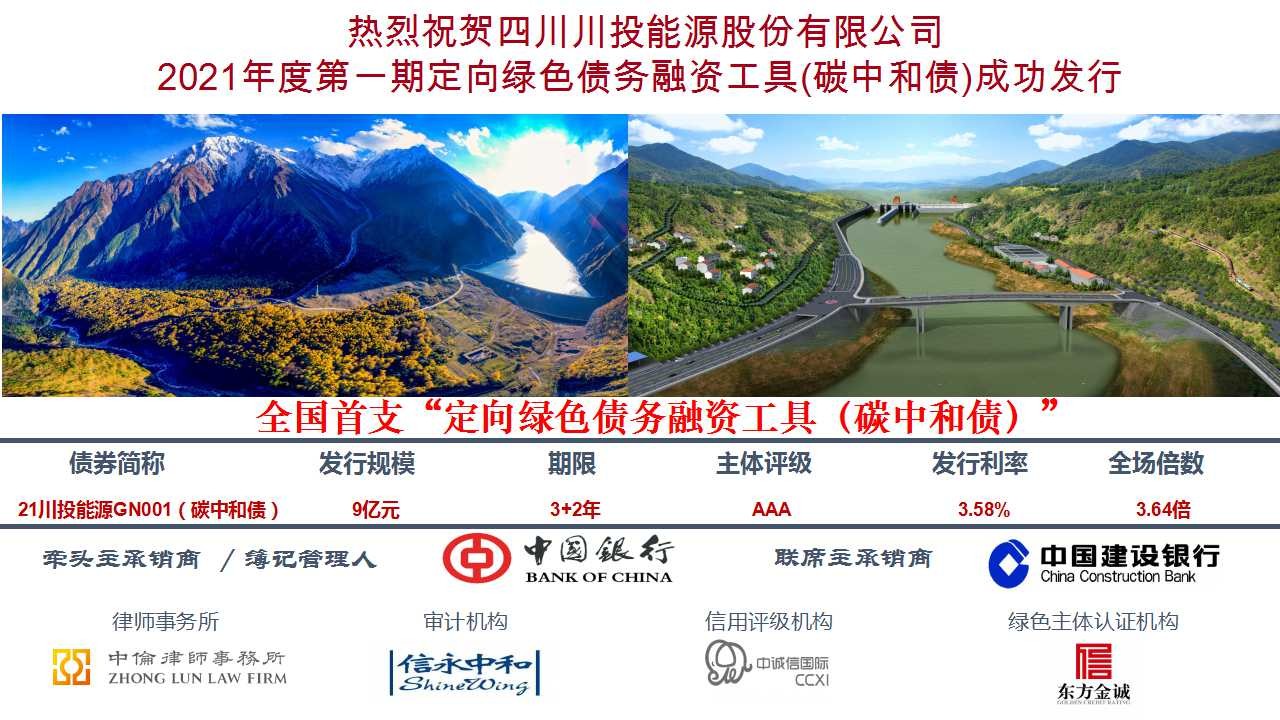 2021年7月15日,四川川投能源股份有限公司成功發(fā)行2021年度第一期定向綠色債務(wù)融資工具(碳中和債)(簡(jiǎn)稱:21川能投GN001,代碼:q21071406.IB),本次發(fā)行金額9億元,期限3+2年,票面利率3.58%,屬目前同期限同定向債務(wù)融資工具的全國(guó)最低價(jià)格。募集資金將專項(xiàng)用于收購(gòu)?fù)ぷ涌谒こ添?xiàng)目20%股權(quán)。