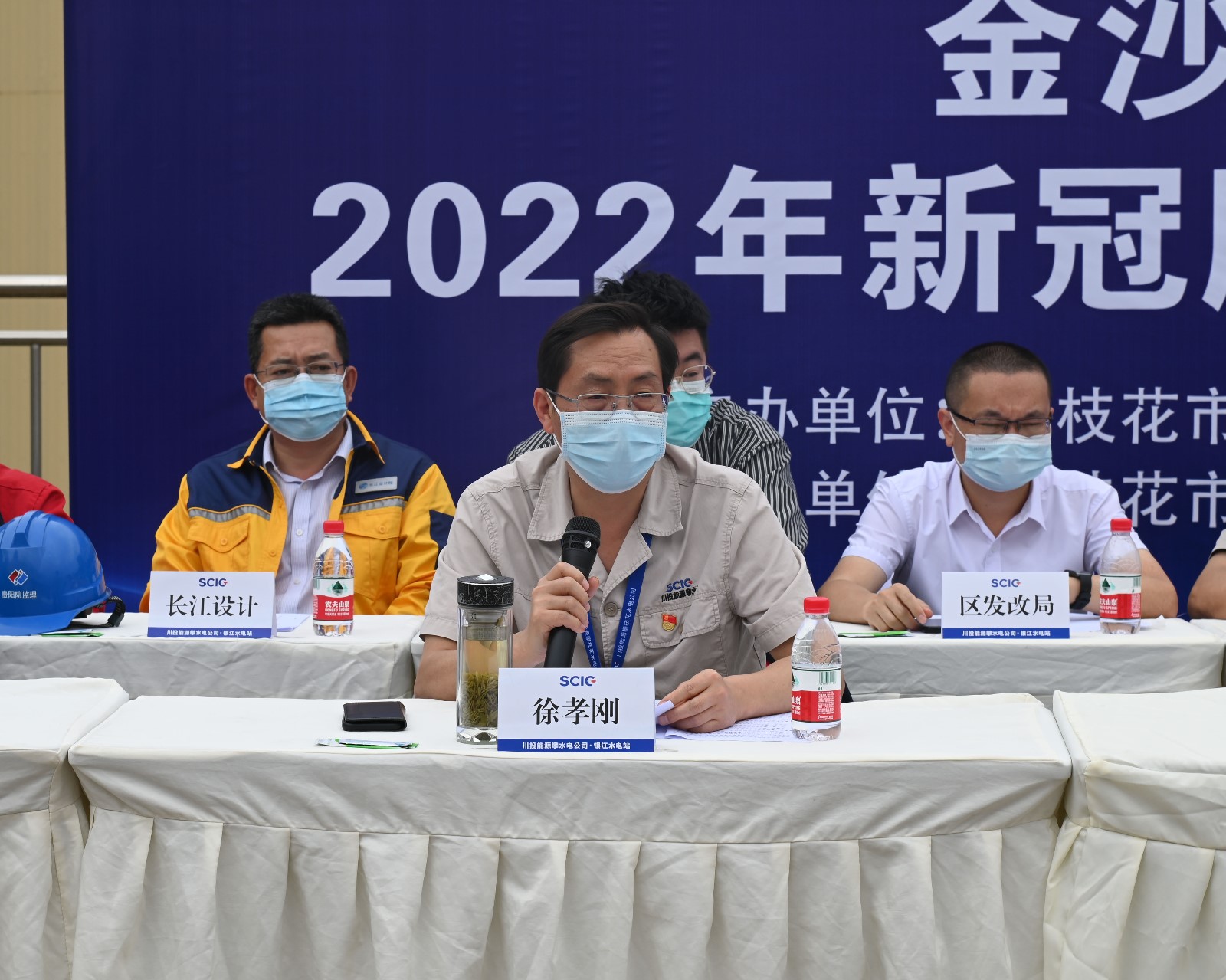 為進一步做好公司新冠疫情防控工作,強化和提高公司與各參建單位的應(yīng)急處置意識和能力,5月21日上午,攀水電公司與東區(qū)疾控中心在銀江水電站35kV施工變電站聯(lián)合組織開展新冠疫情防控應(yīng)急演練。演練由攀水電公司黨總支委員、總經(jīng)理、疫情防控領(lǐng)導小組副組長吳巍嶼主持,川投能源副總經(jīng)理、攀水電公司黨總支書記、董事長、疫情防控領(lǐng)導小組組長徐孝剛擔任演練總指揮,攀枝花市東區(qū)政府副區(qū)長王靜,東區(qū)人大黨組副書記、副主任陳康,東區(qū)有關(guān)部門負責人和公司疫情防控領(lǐng)導小組主要成員及各參建單位負責人到現(xiàn)場觀摩演練。