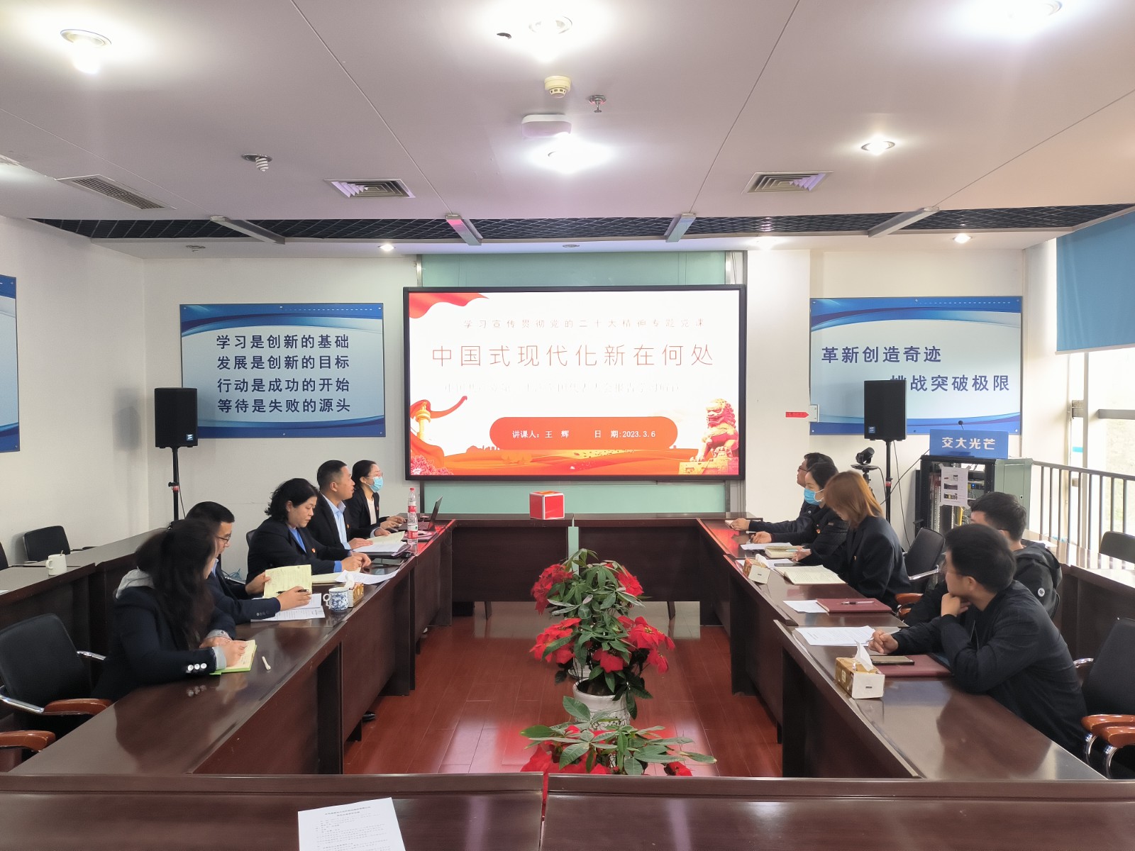 3月6日,為全面深入學(xué)習(xí)領(lǐng)會(huì)貫徹落實(shí)黨的二十大精神,打牢開(kāi)好組織生活會(huì)的思想基礎(chǔ),交大光芒第一黨支部召開(kāi)黨員大會(huì),集中學(xué)習(xí)習(xí)近平同志在學(xué)習(xí)貫徹黨的二十大精神研討班開(kāi)班式上發(fā)表重要講話、中國(guó)共產(chǎn)黨第二十屆中央委員會(huì)第二次全體會(huì)議公報(bào)。第一支部書(shū)記、公司副總工程師兼研發(fā)中心副總經(jīng)理王輝以《中國(guó)式現(xiàn)代化新在何處》為題進(jìn)行專(zhuān)題黨課。