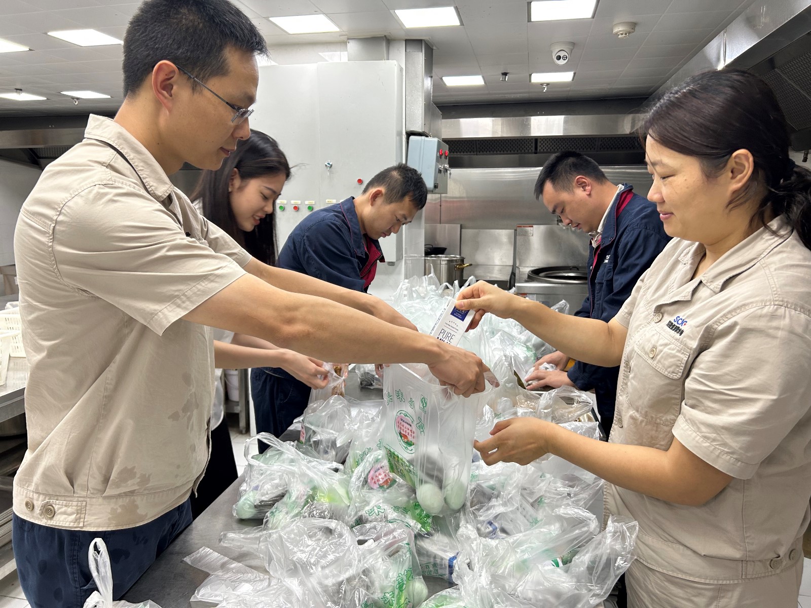 支部黨員、志愿者們放棄了難得的節(jié)日假期,下午就在職工食堂忙碌了起來,鹵雞腿,蒸粽子,煮鹽蛋,采用流水線工作方式,把熱乎乎的雞腿、粽子、鹽蛋、牛奶等提前進行分裝,方便工友們在工地食用。