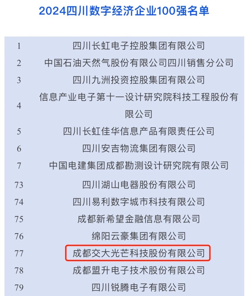 9月26日,四川大企業(yè)大集團(tuán)發(fā)展大會(huì)在成都召開,會(huì)上,四川省企業(yè)聯(lián)合會(huì)發(fā)布了2024年四川企業(yè)100強(qiáng)、制造業(yè)100強(qiáng)、服務(wù)業(yè)100強(qiáng)和數(shù)字經(jīng)濟(jì)100強(qiáng)榜單,交大光芒榮登四川數(shù)字經(jīng)濟(jì)企業(yè)100強(qiáng)榜單,位列第77位。