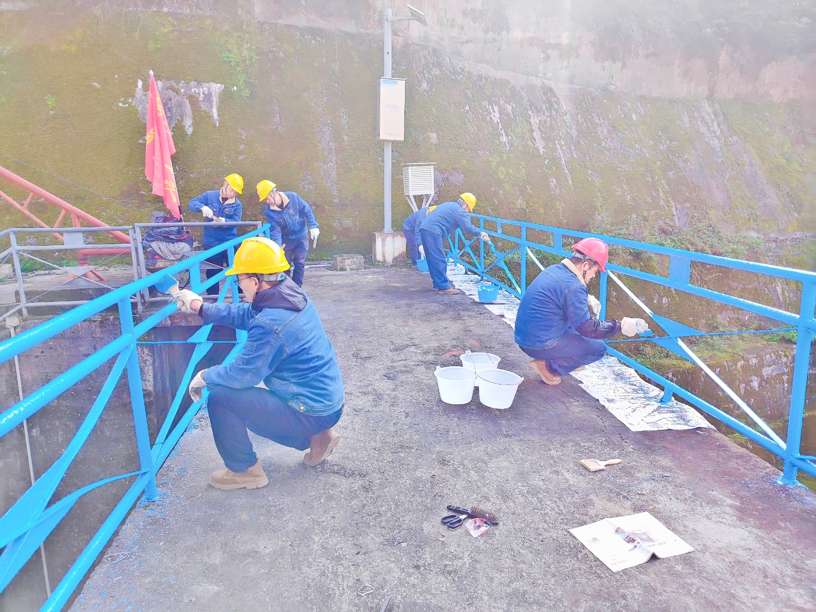 鳳鳴湖水庫是彭州市一級水源保護(hù)地。水庫大壩的護(hù)欄及金屬結(jié)構(gòu)長期暴露于自然環(huán)境中,出現(xiàn)了不同程度的銹蝕脫漆現(xiàn)象,既影響大壩整體美觀,又對運(yùn)行安全埋下隱患。為給大壩換上“新衣”,第三支部黨員擼起袖子迅速行動起來。