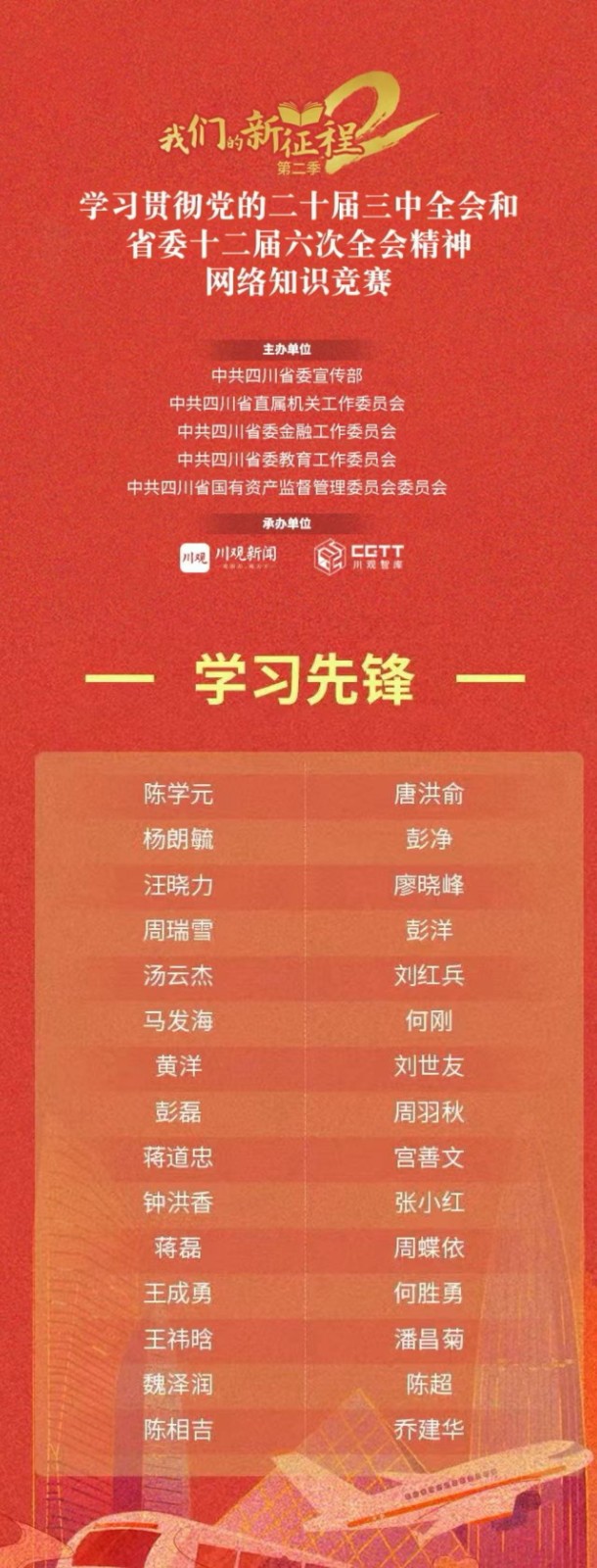 近日,由中共四川省委宣傳部、省委省直機(jī)關(guān)工委、省委金融工委、省委教育工委、省國(guó)資委黨委聯(lián)合主辦,四川日?qǐng)?bào)報(bào)業(yè)集團(tuán)承辦的“我們的新征程”(第二季)網(wǎng)絡(luò)知識(shí)競(jìng)賽公布了獲獎(jiǎng)名單,并為獲獎(jiǎng)人員發(fā)放獎(jiǎng)牌,川投電力所屬天彭電力11名員工憑借扎實(shí)的理論功底和鍥而不舍的努力,從全省32萬余名參與競(jìng)賽的黨員群眾中脫穎而出,進(jìn)入全省個(gè)人排行榜前30名,榮獲“學(xué)習(xí)先鋒”稱號(hào)。