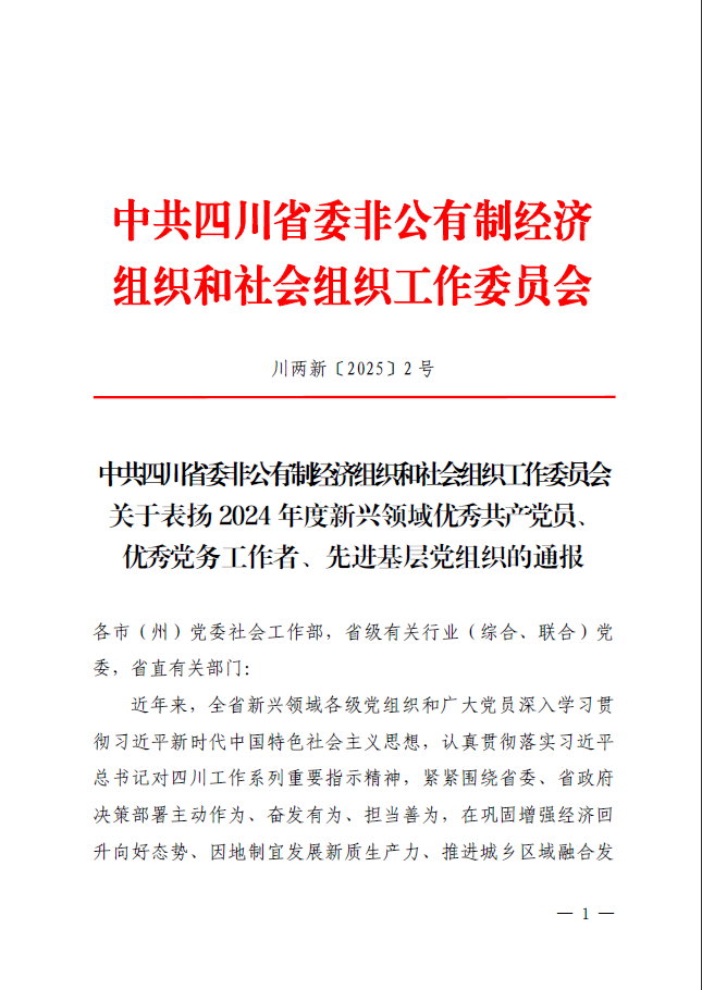 近日,中共四川省委非公有制經(jīng)濟(jì)組織和社會(huì)組織工作委員會(huì)印發(fā)《關(guān)于表?yè)P(yáng)2024年度新興領(lǐng)域優(yōu)秀共產(chǎn)黨員、優(yōu)秀黨務(wù)工作者、先進(jìn)基層黨組織的通報(bào)》,川投能源黨委交大光芒黨總支獲評(píng)“四川省2024年度新興領(lǐng)域先進(jìn)基層黨組織”稱(chēng)號(hào)。