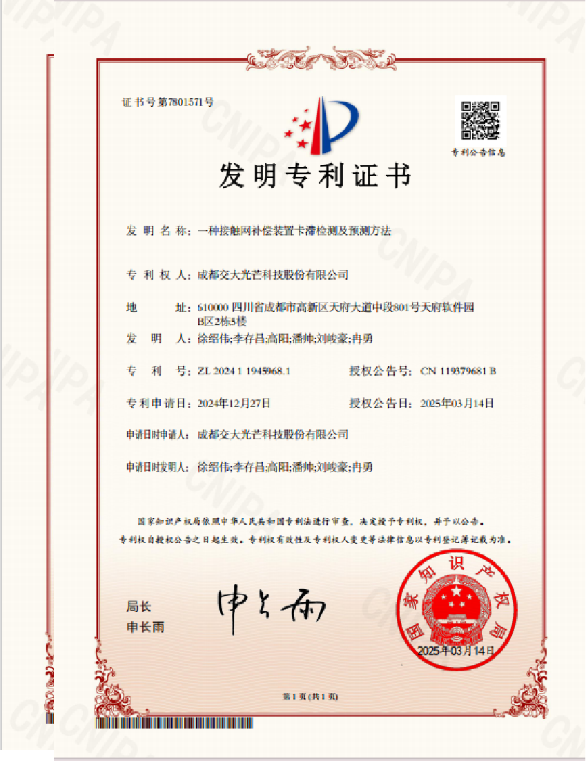 近日,川投能源所屬交大光芒公司“接觸網(wǎng)補(bǔ)償裝置卡滯檢測(cè)及預(yù)測(cè)方法”和“基于多維數(shù)據(jù)的列車融合定位方法”兩項(xiàng)創(chuàng)新技術(shù)獲得國(guó)家知識(shí)產(chǎn)權(quán)局發(fā)明專利授權(quán)。截至目前,交大光芒鐵路接觸網(wǎng)檢測(cè)監(jiān)測(cè)智能化相關(guān)創(chuàng)新技術(shù)累計(jì)獲得發(fā)明專利授權(quán)達(dá)到9項(xiàng),另有多項(xiàng)創(chuàng)新技術(shù)已申請(qǐng)發(fā)明專利并獲受理。
