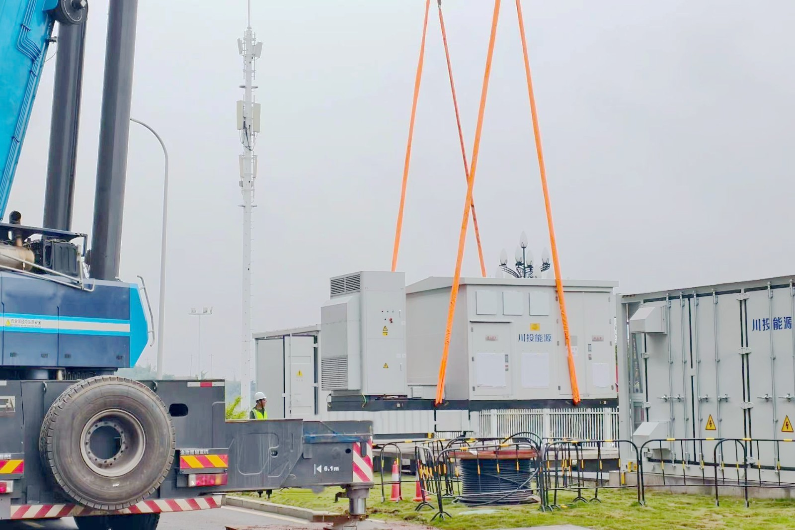 10月24日,四川時代60MW/120MWh工商業(yè)用戶側(cè)儲能示范項目一期工程位于YB1、YB2廠區(qū)內(nèi)儲能設(shè)備(以下簡稱“四川時代項目”)正式啟動吊裝作業(yè),作為項目建設(shè)的關(guān)鍵節(jié)點,儲能設(shè)備的吊裝標志著工程進入全面加速推進階段。截至目前,項目已完成位于YB5、YB6廠區(qū)內(nèi)儲能設(shè)備吊裝及相關(guān)工作,整體施工穩(wěn)步有序推進。