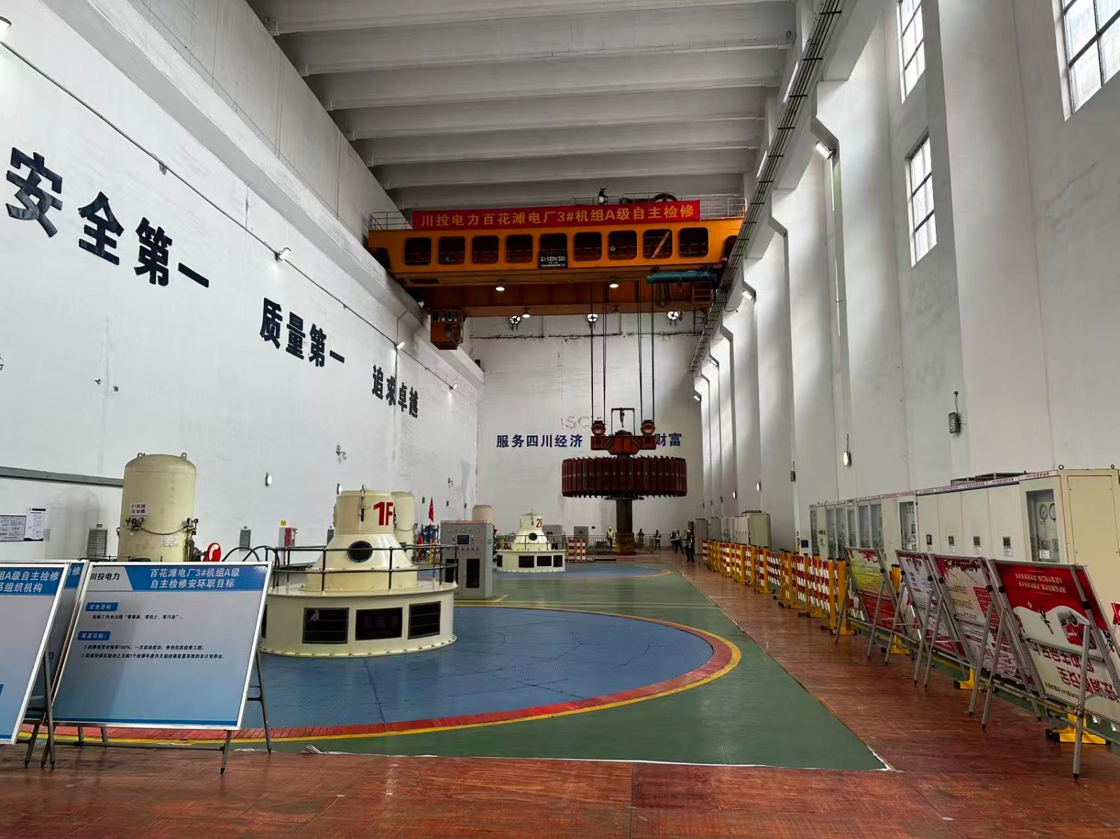 9時16分,起吊工作正式啟動,川投電力黨委副書記、總經(jīng)理蔡承德,川投電力黨委委員、副總經(jīng)理王偉,川投電力副總經(jīng)理陳云明及生技部、安環(huán)部相關(guān)人員現(xiàn)場指導(dǎo)工作。作業(yè)過程中,現(xiàn)場指揮指令精準(zhǔn),操作人員默契配合,起重、監(jiān)護、技術(shù)保障等各崗位人員各司其職、協(xié)同作戰(zhàn)。從轉(zhuǎn)子固定、吊具連接到起吊轉(zhuǎn)運,每一步操作都嚴(yán)格按照技術(shù)規(guī)范,穩(wěn)步推進。全體參檢人員全神貫注、密切監(jiān)控設(shè)備運行狀態(tài)和轉(zhuǎn)子起吊姿態(tài),及時應(yīng)對可能出現(xiàn)的突發(fā)情況,確保整個吊轉(zhuǎn)子過程安全、平穩(wěn)、有序。