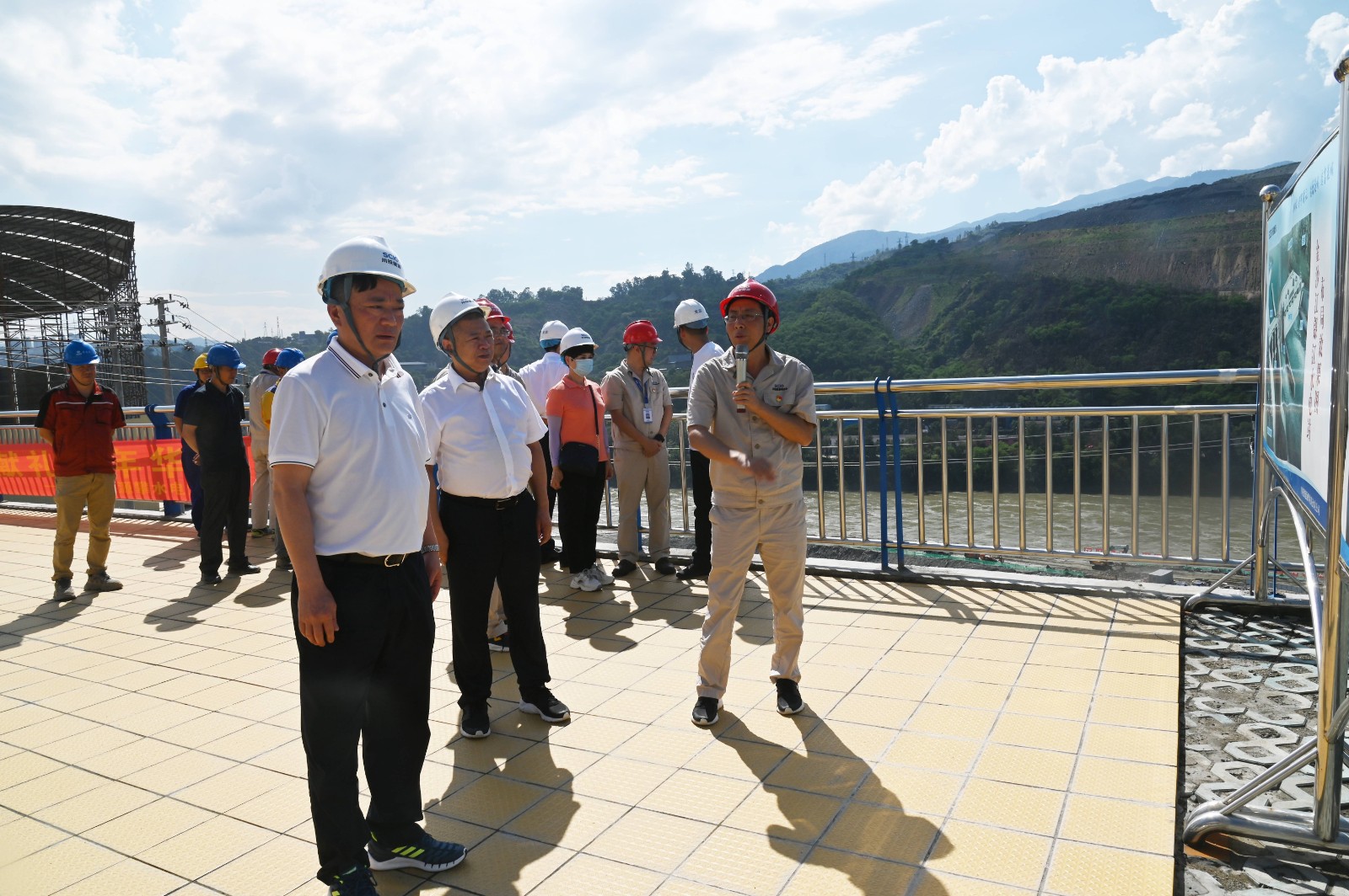 李明舟一行在銀江水電站施工變電站觀景平臺聽取了川投能源副總經(jīng)理、攀水電公司黨總支書記、董事長徐孝剛匯報了銀江水電站工程建設(shè)、防洪度汛、安全文明施工、環(huán)保水保等方面工作情況。