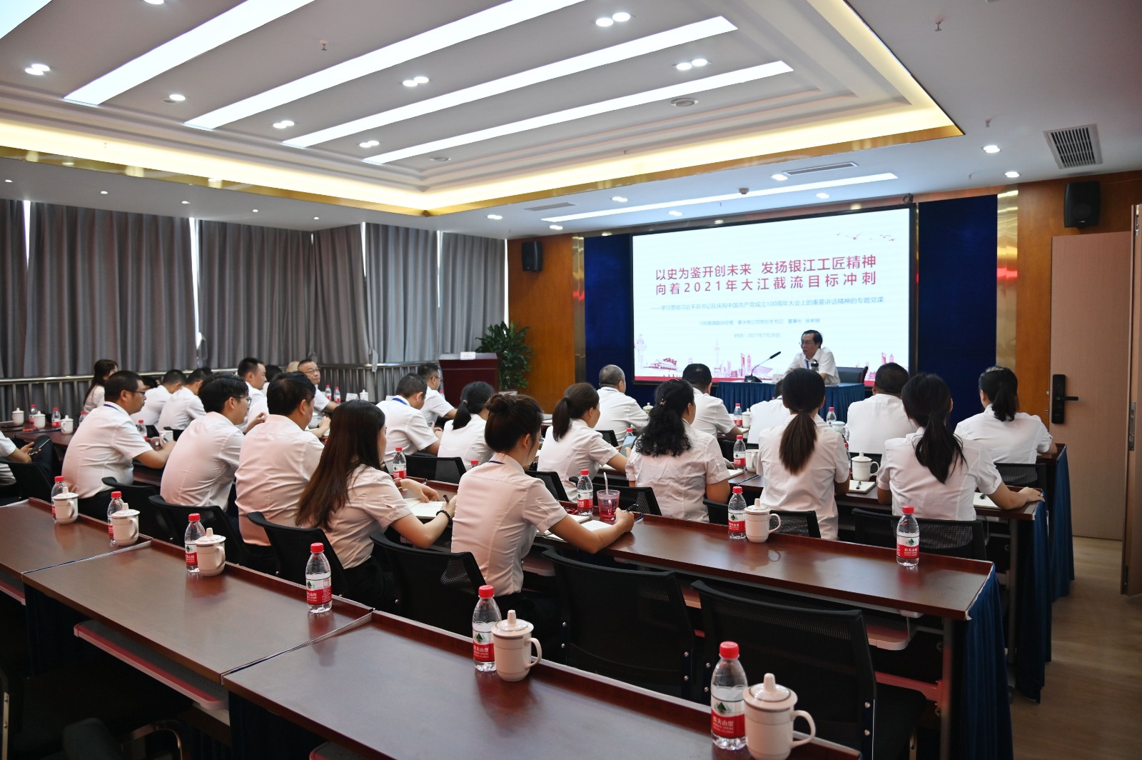 簽約儀式后,川投能源副總經理、公司黨總支書記、董事長徐孝剛做了題為《以史為鑒開創(chuàng)未來,發(fā)揚銀江工匠精神,向著2021年大江截流目標沖刺》的專題黨課,帶領大家學習貫徹習近平總書記在慶祝中國共產黨成立100周年大會上重要講話精神。他表示,距離大江截流的倒計時越來越近,本次“師帶徒”簽約儀式,一是深入領會習近平總書記的重要講話精神,從黨史中汲取推動工程建設和公司高質量發(fā)展的強大動力;二是傳承工匠精神,培育銀江工匠文化,激勵全體銀江建設者朝著既定目標前進,向著大江截流沖刺;三是廣泛培養(yǎng)銀江建設者的創(chuàng)新意識,建設知識型、技能型、創(chuàng)新型水電建設大軍,最大程度激發(fā)各參建單位的創(chuàng)新才能。