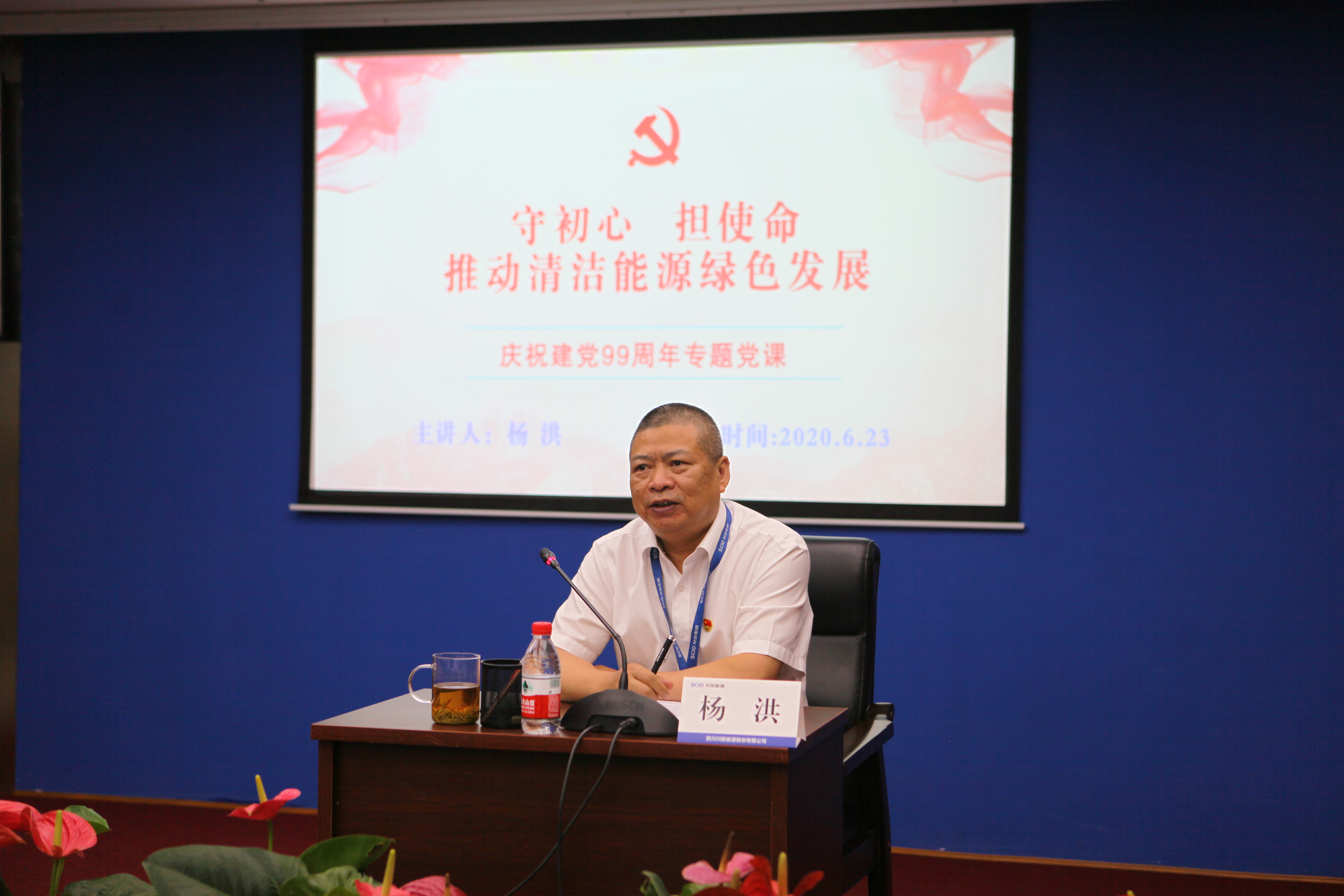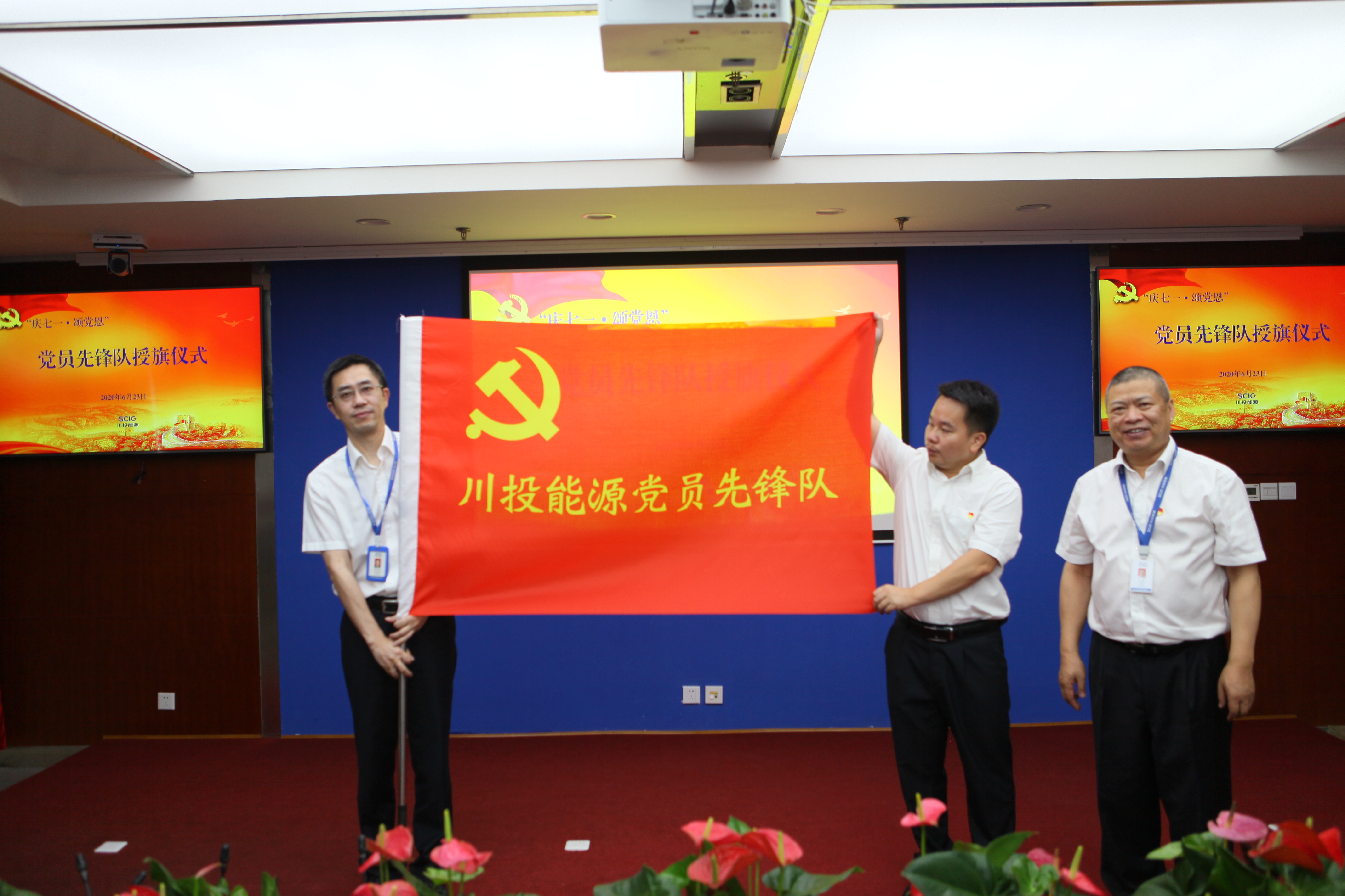 值此川投能源“紅色引擎藍(lán)籌先鋒”(簡稱“五個(gè)先鋒”)黨建品牌創(chuàng)建工作引向深入之際,6月23日,川投能源黨委采用現(xiàn)場和視頻會(huì)議相結(jié)合的方式,以黨員承諾踐諾、黨員先鋒隊(duì)授旗、發(fā)布公司黨建品牌標(biāo)識(shí)以及公司黨委書記講黨課等內(nèi)容為載體,組織全體黨員、入黨積極份子、新黨員代表隆重召開紀(jì)念建黨九十九周年大會(huì),為中國共產(chǎn)黨第99個(gè)生日獻(xiàn)上賀禮。公司黨委副書記、工會(huì)主席楊超龍主持會(huì)議。